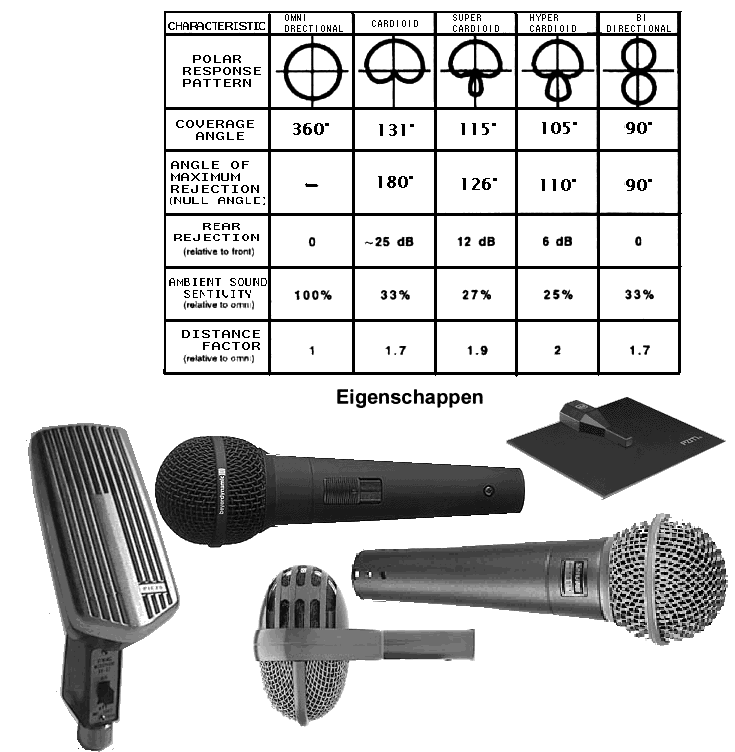 supercardioid en hyper-cardioide vormen micros kun je beter richten en pikken het geluid uit een bepaalde richting beter op dan uit andere richting. Dit heeft als voordeel dat je omgevingsgeluid beter kunt afsluiten Het nadeel is dan natuurlijk dat de cardioide microfoon een beperkte werkhoek heeft. Voor een normale cardioide microfoon is dit ongeveer 130 graden. De super cardioid zit op ongeveer 115 graden en de hyper cardioid op 105 graden. De laatste twee pikken echter ook iets op aan