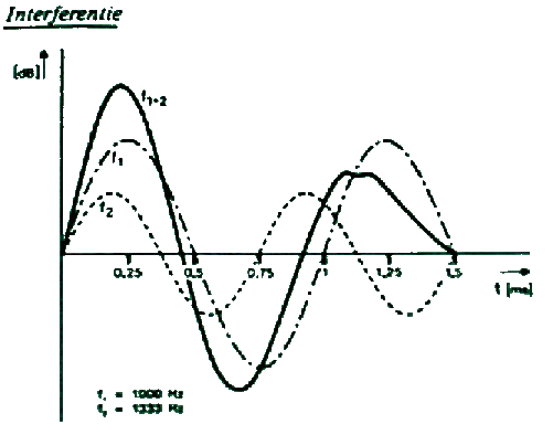 De grondtoon is de eerste harmonische. Is deze 1000 hz , dan heeft de tweede harmonische een freqwentie van 2000Hz, de derde harmonische een freqentie van 4000Hz, enzovoort . dit kan wel tot meer dan 10 harmonischen toe doorgaan , zij het dat de strekte van de opvolgende harmonische steeds verder afneemt( kunnen ver boven de bovenste gehoorgrens uitkomen). in deze boventoon onderscheiden we even en oneven harmonischen, die elk hun eigen uitwerking op de klank hebben. Ook worden er wel niet-harmonischen opgewekt, boventonen die niet in een rekenkundige verhouding tot de grondtoon staan.Onder interferentie verstaan we de wederzijdse beinvloeding van trillende .daarbij worden de amplitudes van de trillingen telkens bij elkaar opgeteld of van elkaar afgetrokken . Het resultaat daarvan is een nieuw trillingsverloop (resultante) dat de optelsom is van de twee (of meer) oorspronkelijke trillingen.